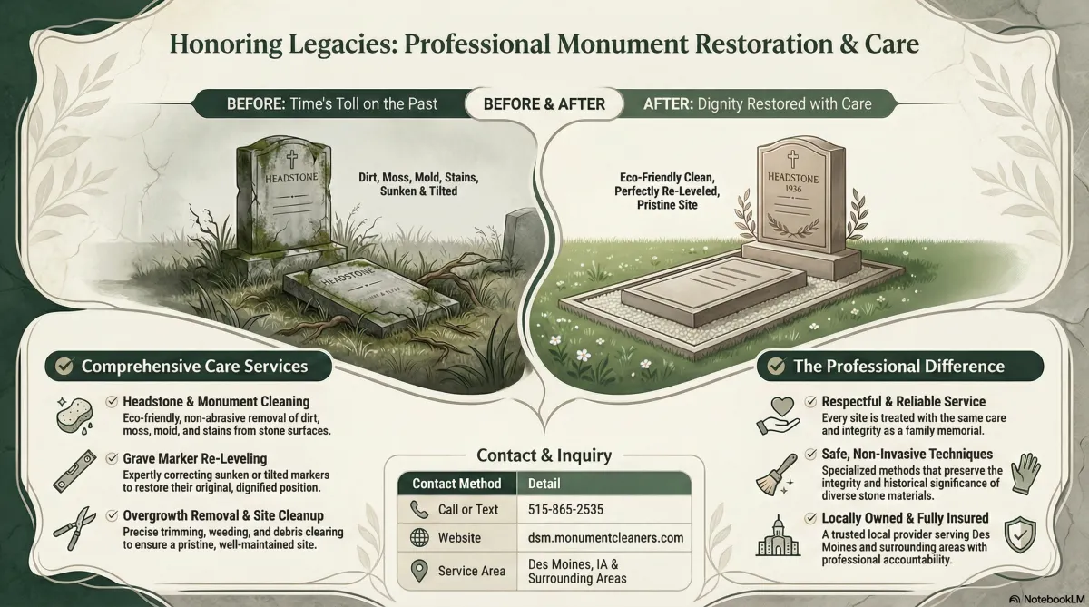 Whether you’re looking to restore a weathered headstone, tidy a neglected site, or schedule regular maintenance, our experienced team is here to help. At Des Moines Monument Cleaning, we treat every site as if it were our own family’s memorial, ensuring lasting respect and care.
